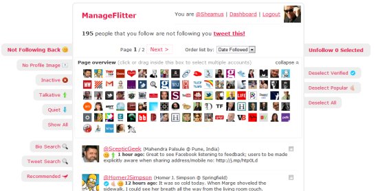 ManageFlitter offers a streamlined free version, but If you'd want to easily manage multiple accounts, you'd have to prefer the paid pro version. To be honest, I couldn't cover everything that ManageFlitter can do, only the very basics. So, basically, if you choose to use Twitter as a two-way conversation vehicle (like I do), you may want to unfollow people who are not following you back. This helps keep your numbers in balance.
